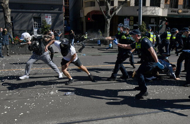 Police use pepper spray on protesters during an anti-lockdown protest in Melbourne today. James Ross/AAP Image via AP
