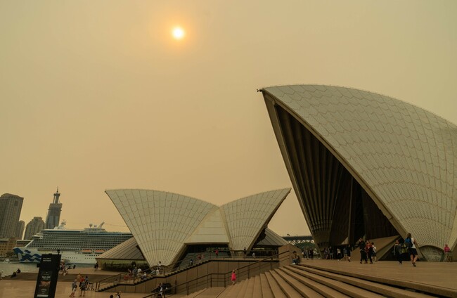 The sky over the Opera House covered by heavy red smoke from bushfire. Shutterstock/Natsicha Wetchasart