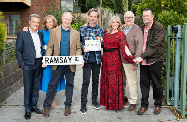 Stefan Dennis, Annie Jones, Geoff Paine, Guy Pearce, Lucinda Cowden, Ian Smith and Paul Keane on set for Neighbours’ 2022 finale. PA