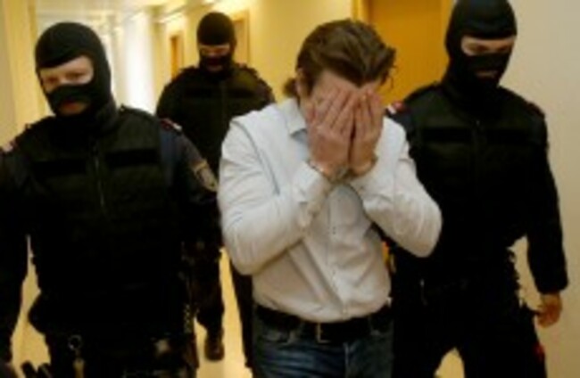 A 19-year-old suspected Islamic State supporter, center, is surrounded by officers when arriving for his trial at the main court in Vienna, today. Ronald Zak