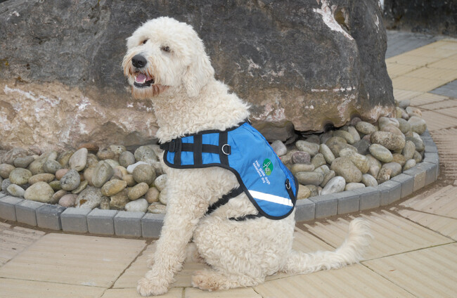 An assistance dog in training in official jacket. Irish Guide Dogs
