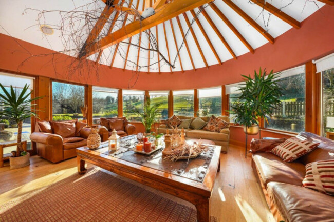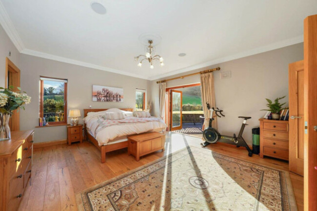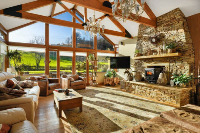 At the heart of the home is the main reception room, where a dramatic floor-to-ceiling apex window frames sweeping views of Wicklow’s countryside. Exposed beams, solid oak floors and a custom-built sandstone hearth create an atmosphere that is both impressive and inviting.