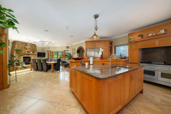 The sense of flow continues throughout the living areas. The vast kitchen and dining space, almost 12 metres in length, is a showpiece and features a handmade oak kitchen, granite countertops, a six-ring gas range and a convivial central island with breakfast bar. A second stone hearth anchors the dining area, while French doors lead directly to the south-facing patio, perfect for outdoor dining and summer gatherings.