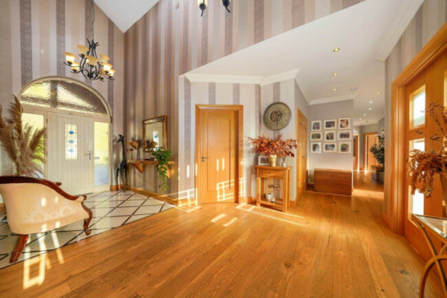 Set amidst just over an acre of landscaped gardens, from the moment you enter through the electric gates and step into the vaulted entrance hall, the scale and craftsmanship of this home are immediately apparent. A soaring double-height ceiling, dotted with skylights and chandeliers, sets the tone for the light-filled spaces beyond.