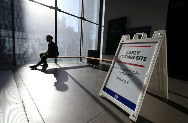 A security guard sits outside a early voting site in New York. Alamy Stock Photo