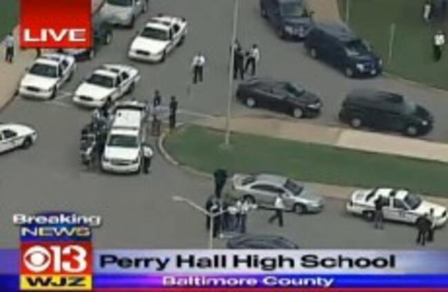 Police at the scene of today's school shooting. Screen grab of CBS Baltimore livestream.