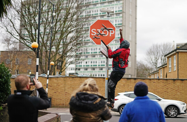The piece of street art – a traffic stop sign covered with three aircraft resembling military drones – was revealed at the intersection of Southampton Way and Commercial Way in Peckham at midday yesterday.