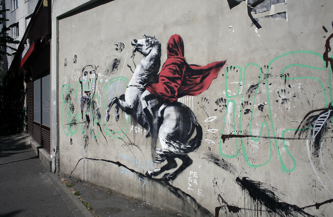 A graffiti piece believed to be attributed to street artist Banksy is seen on a wall along a street in Paris. Thibault Camus/AP/Press Association Images
