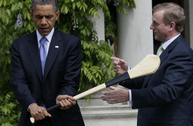 Barack Obama holds a hurl during his 2011 visit to Ireland. AP/Press Association Images