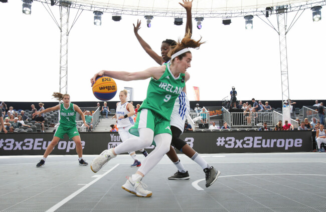 Gráinne Dwyer of Ireland runs with the ball against Alice Nayo of France during FIBA 3X3 Eurocup 2017 Alamy Stock Photo