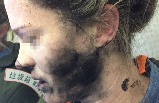 Pictures show the woman, who was not named, with a blackened face and neck and blisters on her hands.