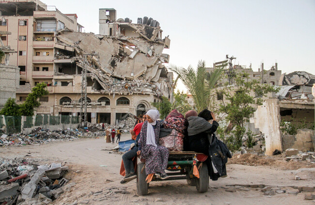Palestinians walk along Salah al-Din Street in Gaza City after the Israeli occupation army forcibly removed them under fire and shelling from their positions in the Jabalia camp in the northern Gaza Strip. Alamy Stock Photo