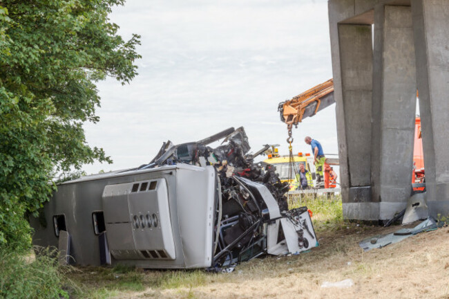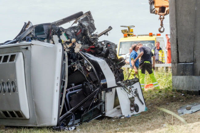 The Belga news agency reported that the driver lost control on the E40 highway near the Flanders coast, sending the coach crashing into an overpass.