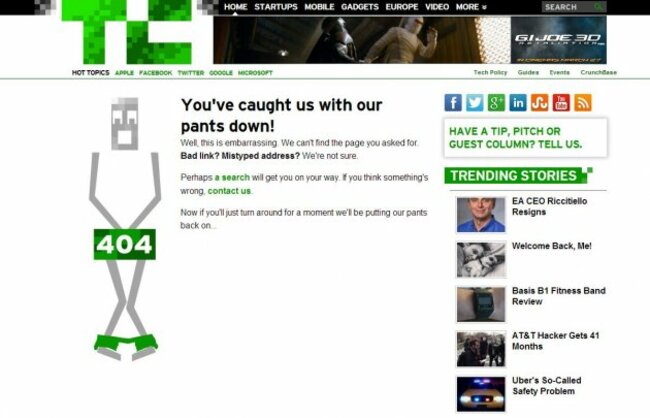 The TechCruch error page is caught with its pants down