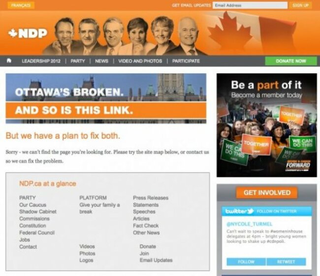 Smooth work in this political 404 page from Canada’s NDP party.