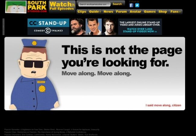 South Park has a rotation of 404 pages featuring characters from the show.