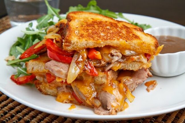 1. Roast beef grilled cheese sandwich with carmelised onions, pepper and horseradish