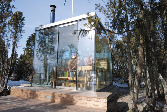 The ‘semi-autonomous sauna’ designed by architects Indrek Allmann and Tarmo Miller stands apart from a main residential house – its complete glass structure allows uninterrupted views of the sea.