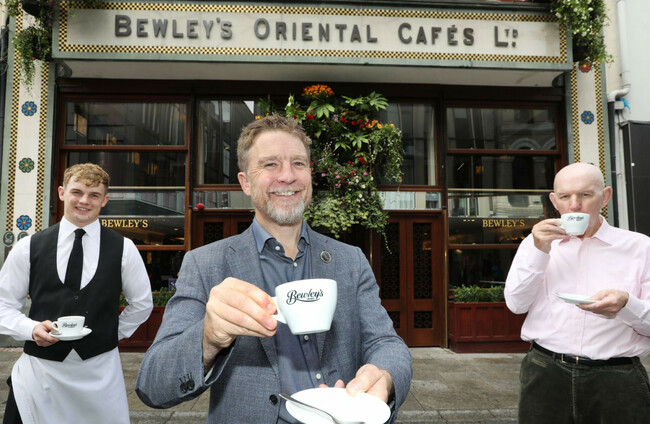 Three generations of the Campbell family Cól Campbell, Managing Director of Bewley’s Grafton St, Paddy Campbell, and Felix Campbell pictured at the reopening of the iconic Bewley’s Grafton St. in 2020. Leah Farrell/RollingNews.ie