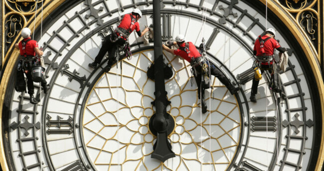 File photo dated 18/08/14 of a specialist technical abseil team cleaning and inspecting one of the four faces of Big Ben. Yui Mok/PA Wire/PA Images