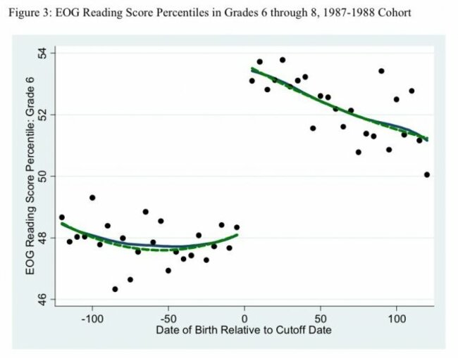 In a new working paper, Birthdays, Schooling and Crime, Duke University researchers Philip Cook and Songman Kang found through tracking five groups of children from a North Carolina public school in the US that the test scores of older students were indeed higher (and in some cases, significantly higher) than those of their younger peers in the same grade.