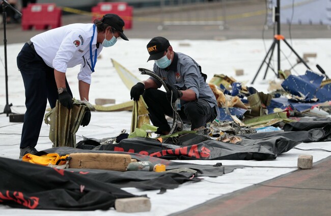 Investigators of the National Transportation Safety Committee inspect parts of the aircraft’s debris recovered from the Java Sea. PA