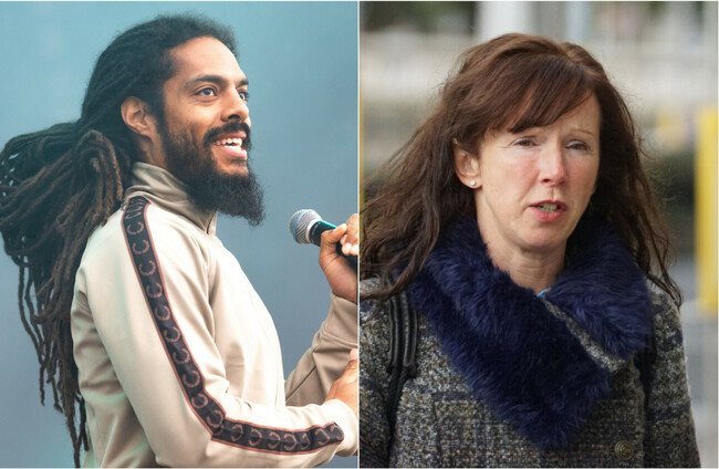 Left, Bobby Vylan of punk duo Bob Vylan, and right, Independent Ireland councillor Linda de Courcy. Alamy/Tom Tuite