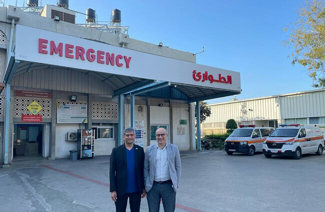 Dr Nick Maynard, right, and Professor Bijen Patel outside a hospital in Gaza Dr Nick Maynard/PA