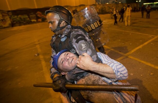 Military police detain a man during an anti-government protest in Rio de Janeiro, Brazil. (AP Photo/Victor R. Caivano)