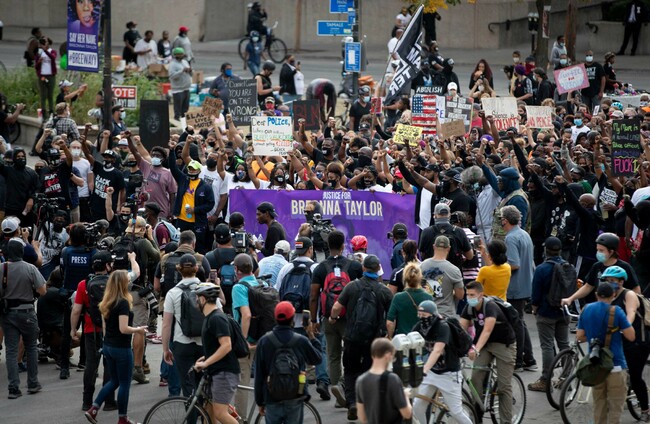 A DIVERSE CROWD of hundreds marched in Louisville’s streets chanting “Black Lives Matter” last night, the fourth night of protests after a grand jury declined to charge officers in the fatal shooting of Breonna Taylor.
