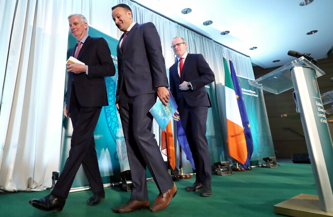 (Left to right) Michel Barnier, Taoiseach Leo Varadkar and Simon Coveney after a press conference at the Dundalk Institute of Technology. Niall Carson