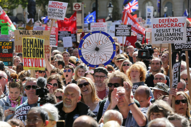 In London, participants heard speeches from opposition politicians on a stage erected on Whitehall before marching through Westminster. Some held hand-written signs reading “defend democracy: resist the parliament shutdown” and “wake up UK! Or welcome to Germany 1933″.