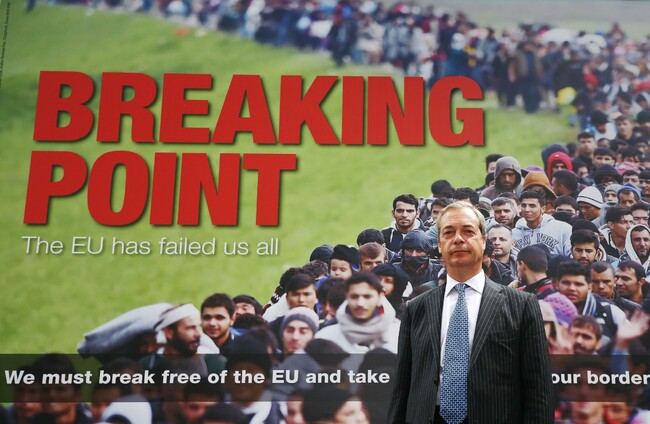 UKIP leader Nigel Farage stands before a Brexit poster featuring a queue of migrants. The poster's anti-immigrant tenor was criticised even by politicians, such as Boris Johnson, urging a Leave vote PA Wire/Press Association Images