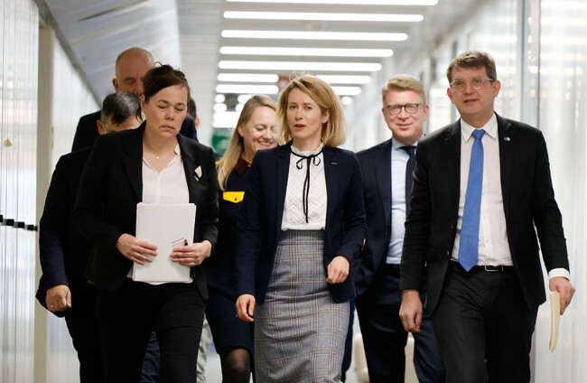 European Union foreign policy chief Kaja Kallas, centre, walks with Minister for Foreign Affairs and Research of Greenland Vivian Motzfeldt, front left, and Denmark's Defense Minister Troels Lund Poulsen, front right, prior to a meeting at EU headquarters in Brussels today. AP Photo/Geert Vanden Wijngaert