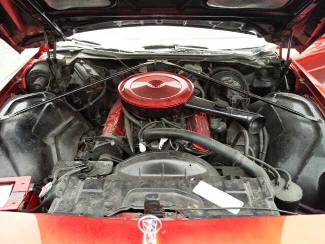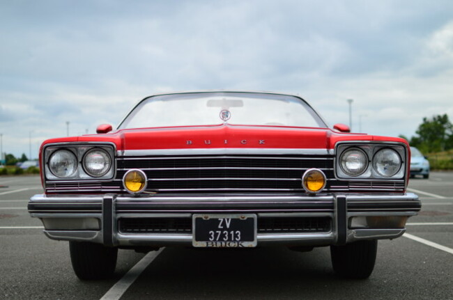 The car looks splendid in apple candy red and its long hood is finished with a Buick tri-shield hood ornament. It features a cross-hatched patterned grille, which flows across the front of the car and under the round headlights, with indicator lights located in the massive chrome front bumper.