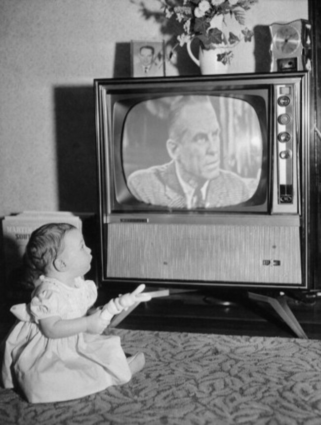 Eight-month-old Andrea Whalen watches TV in February 1961.