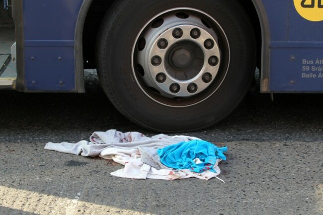 Photos taken at the scene this evening showed blood-spattered clothing next to the front wheel of the bus.