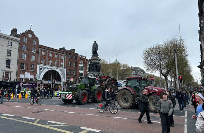 DELAYS AND DIVERSIONS continue in Dublin City centre today after a large protest saw tractors, lorries, and coaches park on O’Connell Street, disrupting public transport.