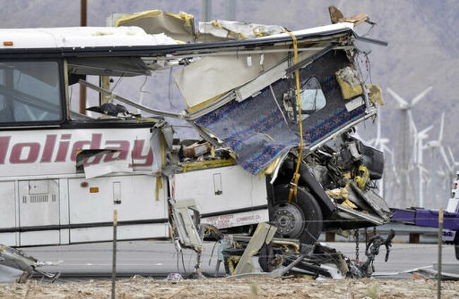 The front of the bus crumpled into the semi-truck’s trailer and debris was scattered across the key route through Southern California. Firefighters used ladders to climb into the bus’s windows to remove bodies, and tow trucks lifted the trailer to make it easier to reach the bus, whose front end was demolished.