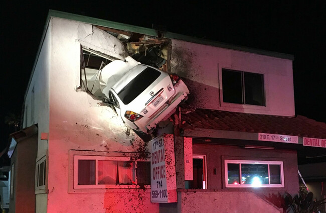 The car hit the centre divider in the town of Santa Ana in south California early on Sunday morning, landing in the office above dentist’s. Authorities said the collision with the divider sent the car soaring.