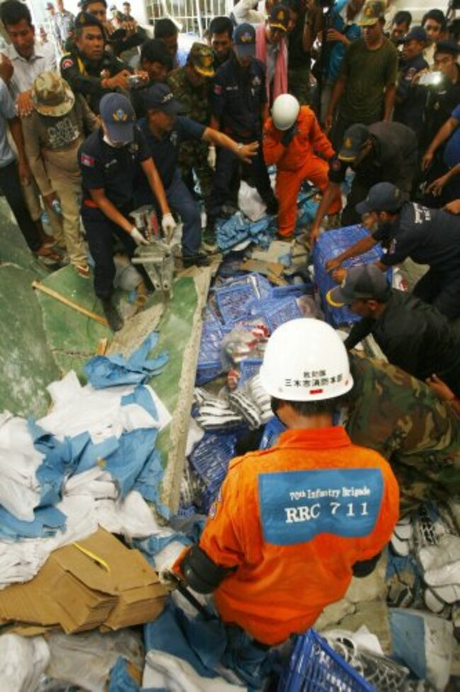 Cambodian rescuers work at the site where factory collapsed. AP Photo/Heng Sinith