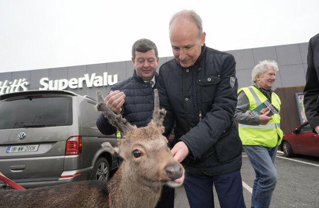 Micheál Martin meets Deermuid the deer during canvassing in Arklow. Alamy Stock Photo