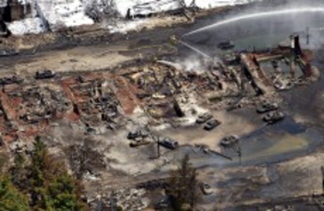 The downtown core lays in ruins as fire fighters continue to water smoldering rubble on Sunday (AP Photo/THE CANADIAN PRESS,Ryan Remiorz)