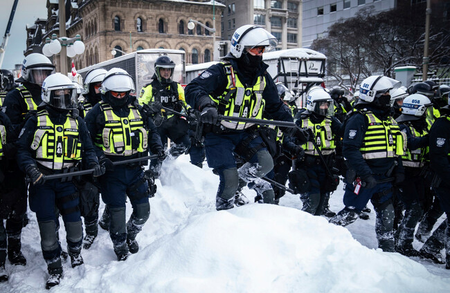 The crackdown on the self-styled Freedom Convoy began Friday, when hundreds of police, some in riot gear and some carrying automatic weapons, descended into the protest zone and began leading demonstrators away in handcuffs through the snowy streets as drivers blared their horns.