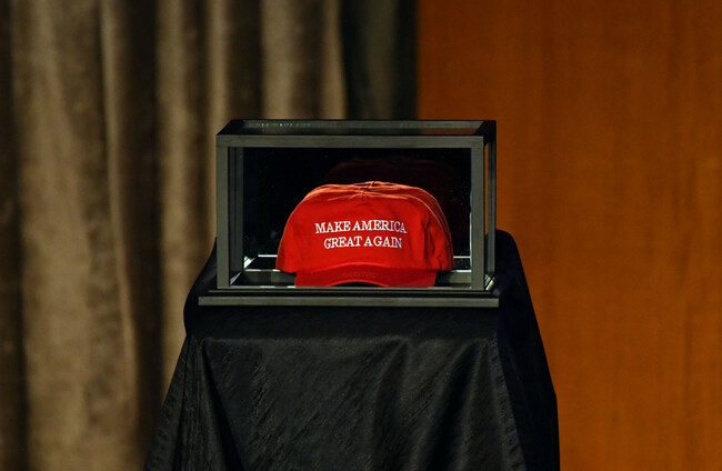 A Make America Great Again hat placed on the side of the stage prior to Donald Trump speaking to supporters at New York last year. SIPA USA via PA Images