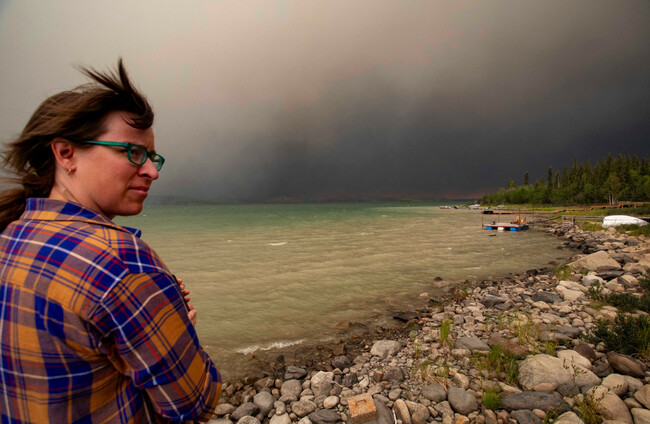 A woman watches a smoke plume roll over Prosperous Lake near Yellowknife on Sunday Alamy Stock Photo