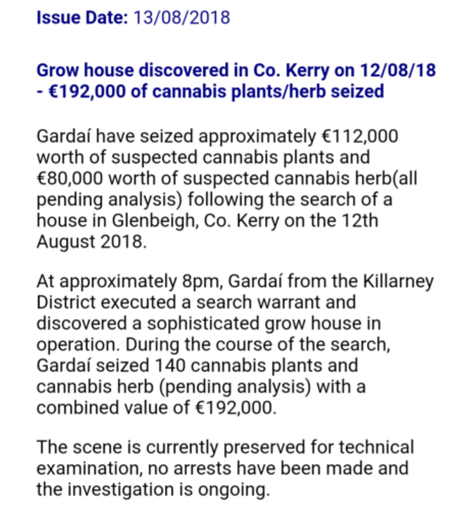 For example, in August this year, garda issued a press release after the seizure of 140 cannabis plants in Co Kerry.