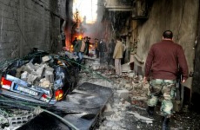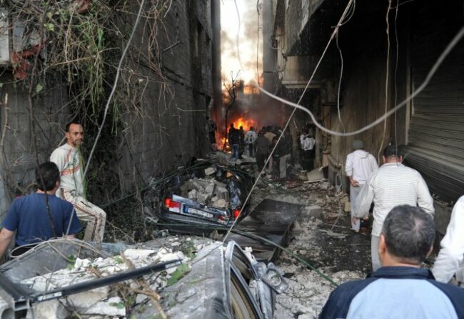The blasts shattered windows, littering the street with glass and debris. Human remains were scattered on the pavement in pools of blood. Six commercial buildings were damaged in the attacks, and dozens of cars were destroyed, SANA said.