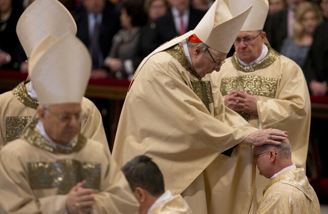 Cardinal George Pell poses his hands on the head of a newly ordained bishop. AP/Press Association Images