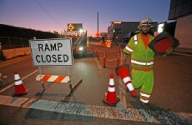 A construction worker blocks off an entry ramp to Interstate 405, one of California's busiest roadways, ahead of a major weekend closure. Ringo H.W. Chiu/AP